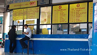 Hualamphong Bahnhof gehören eine Wechselstube, ein Geldautomat, eine Gepäckaufbewahrung, ein Postamt und ein Hotelreservierungsschalter. Für längere Fahrten sollte man einen Platz im Voraus reservieren. Der Bahnhof Noi, auch Thonburi Railway Station ( Tel: (02) 411 31 02) in Thonburi, auf der anderen Seite des Flusses, bietet Zugverbindungen nach Kanchanaburi und zu einigen anderen Orten im Süden. Man sollte sich daher im Voraus erkundigen, von welchem Bahnhof die Züge abfahren. Bahntickets der Thai Railways